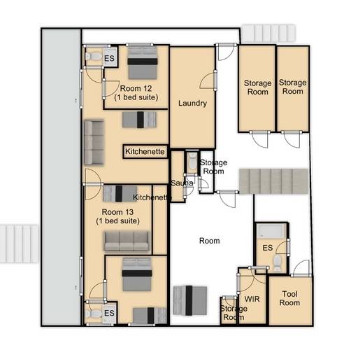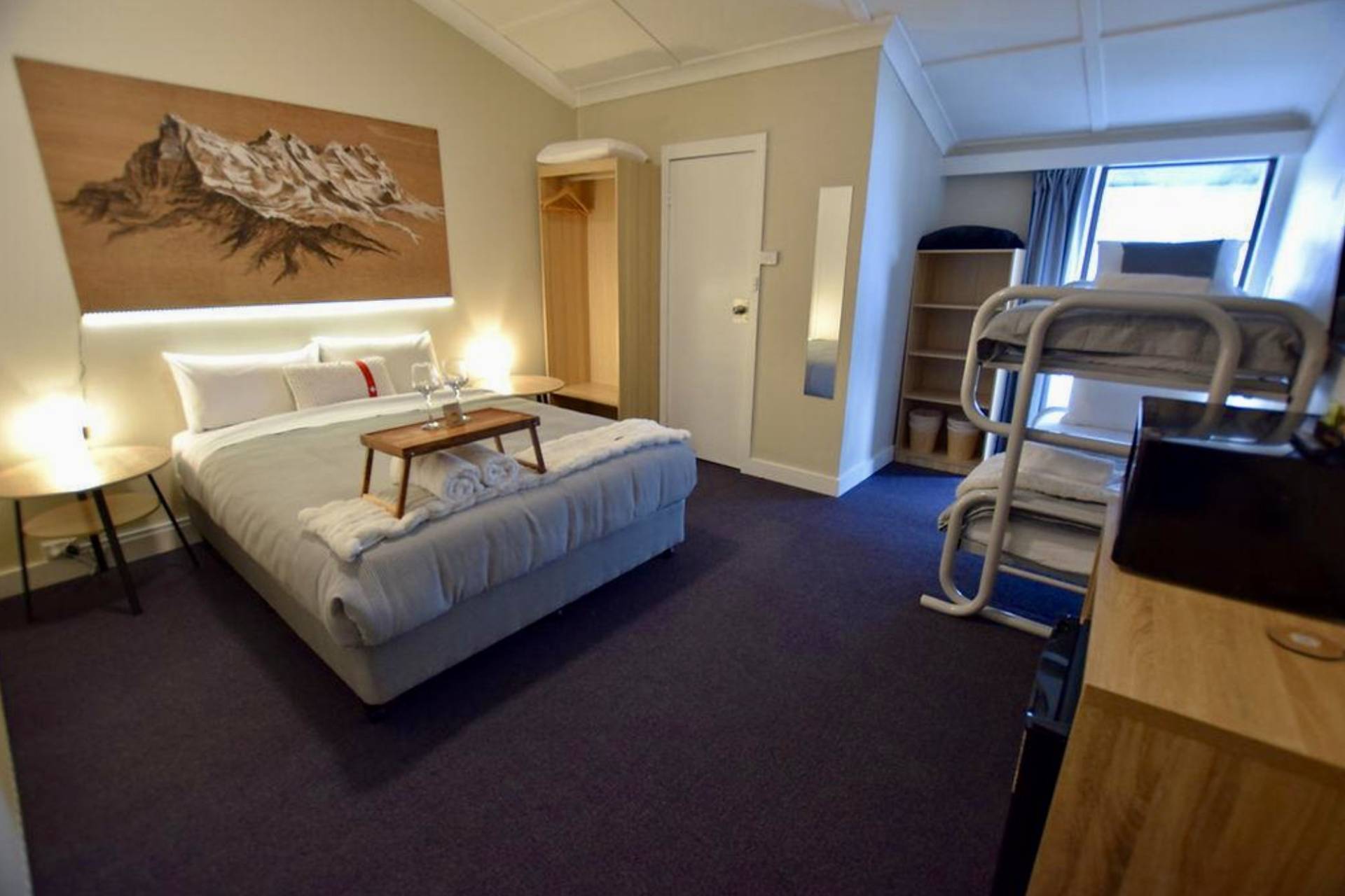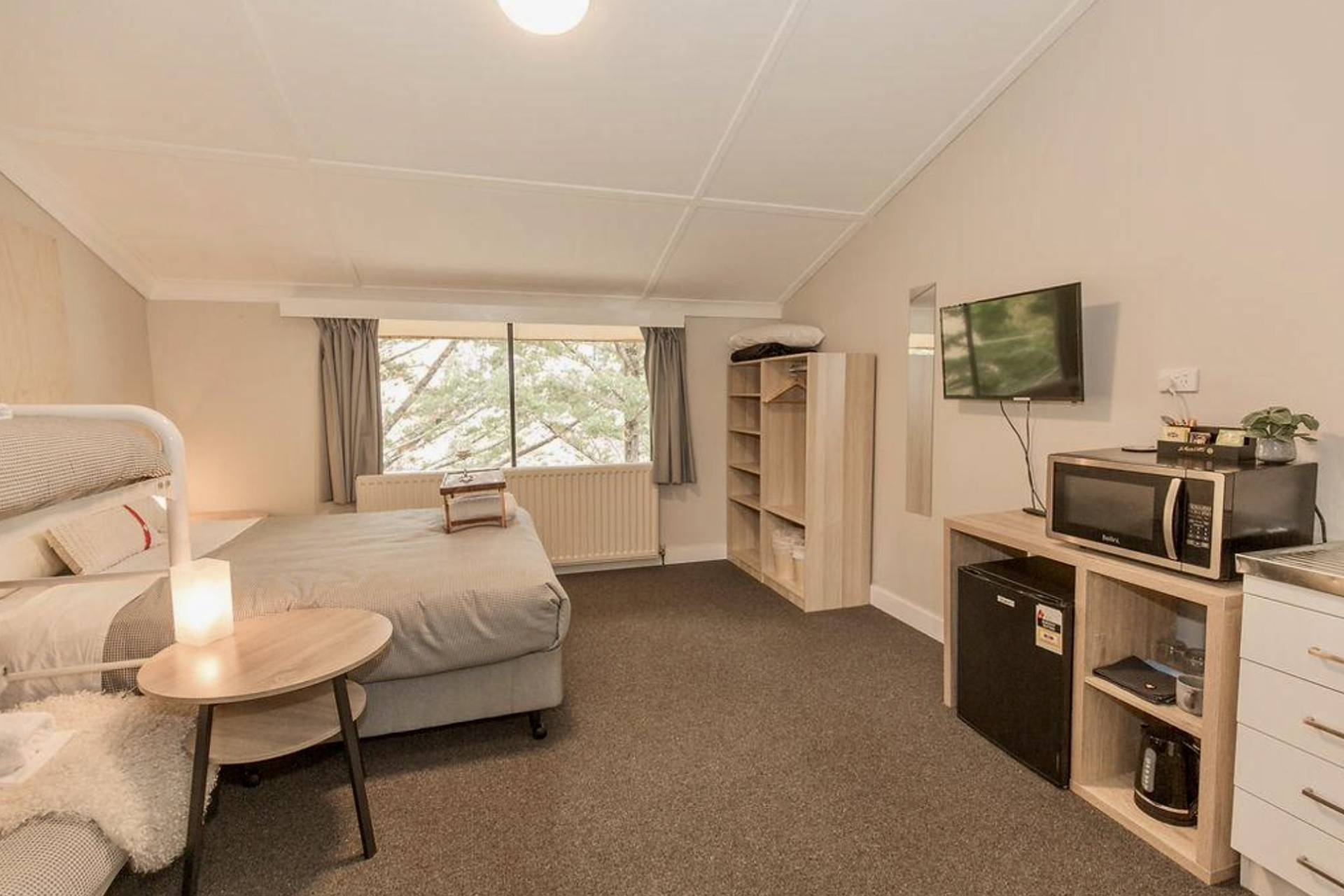 Practical amenities like wardrobes and fridges.