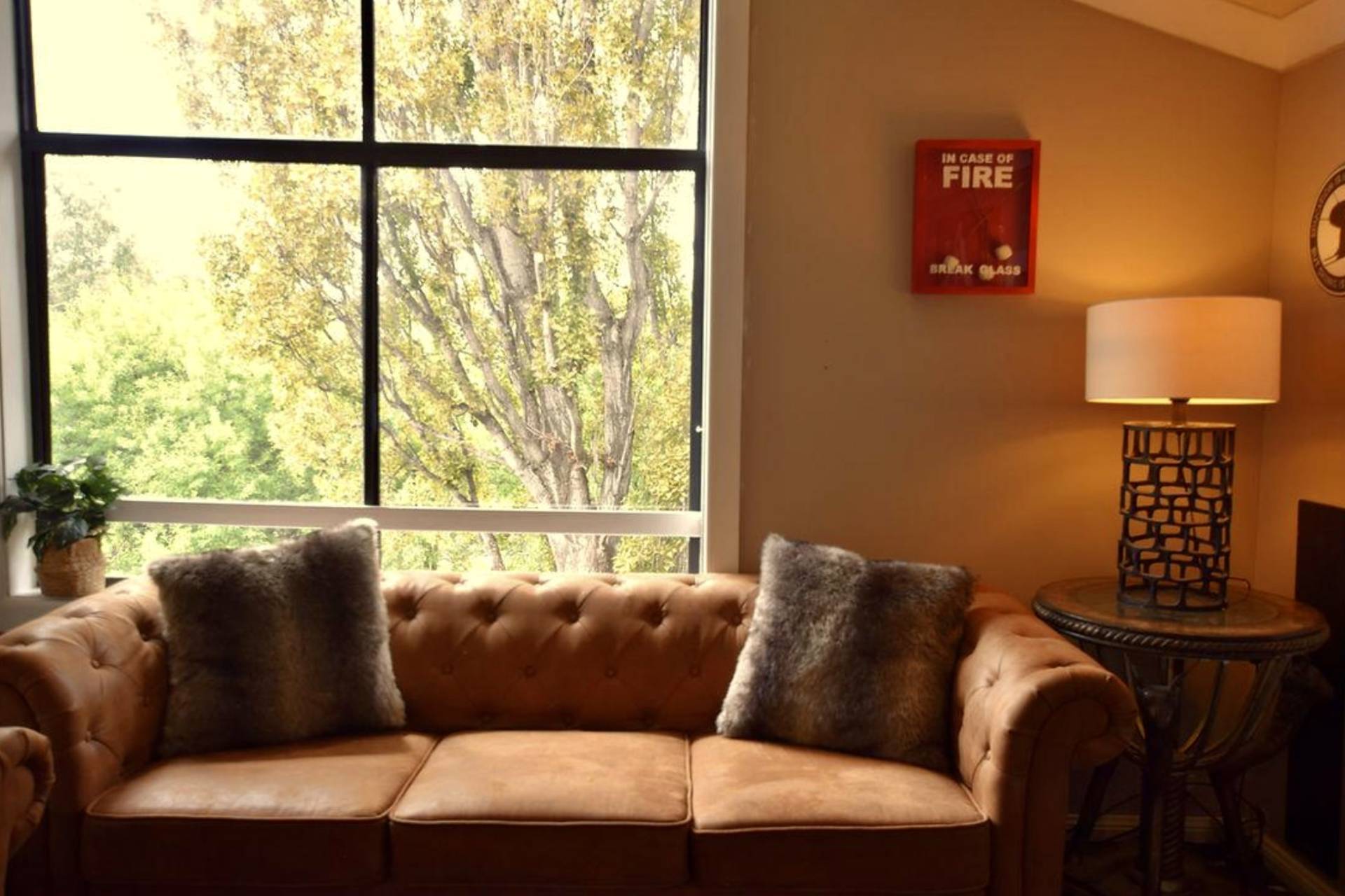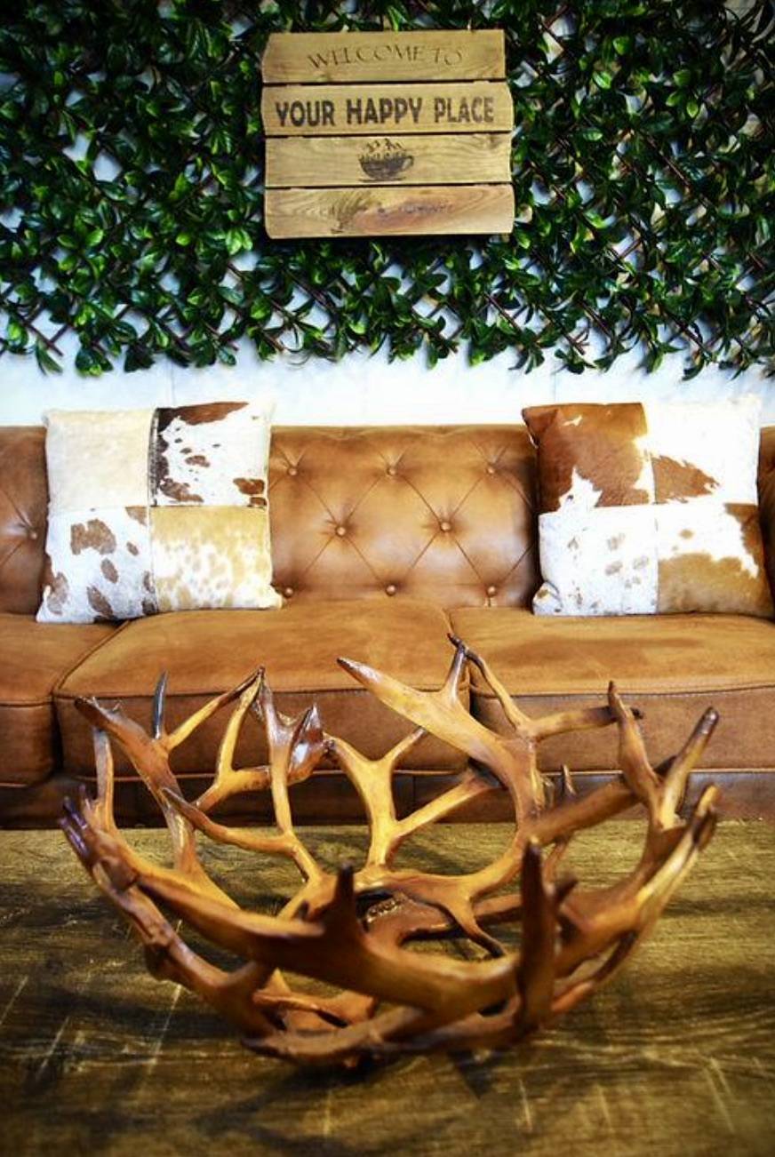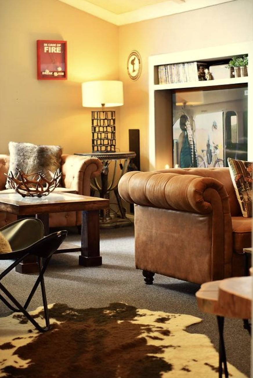 Elegant branded décor and curtains for a cohesive, welcoming ambiance.
